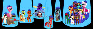 The sound of blues music filled the room, and blue spotlights shone on a band of familiar ponies, each wearing a blue fedora & dark sunglasses. The band featured Thespio on piano, Midnigh