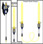 The Tempest Zanber Stingers takes the form of two Blades, crafted by fates mana and emanating a resolute aura. Connected by a taut mana string at their pommels.