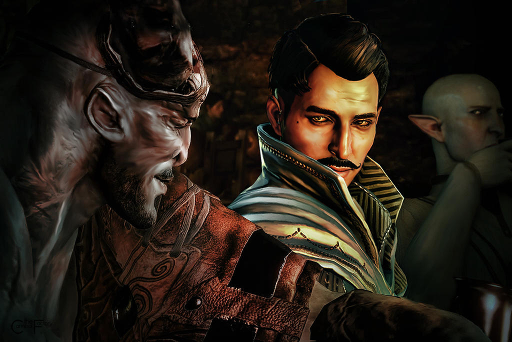 More Dragon Age Inquisition 'behind the scenes' imagined fun - the start of a certain evening described by Dorian in the game, also featuring some epic Solas side-eye. This is why he never drinks in the Tavern anymore, you know.